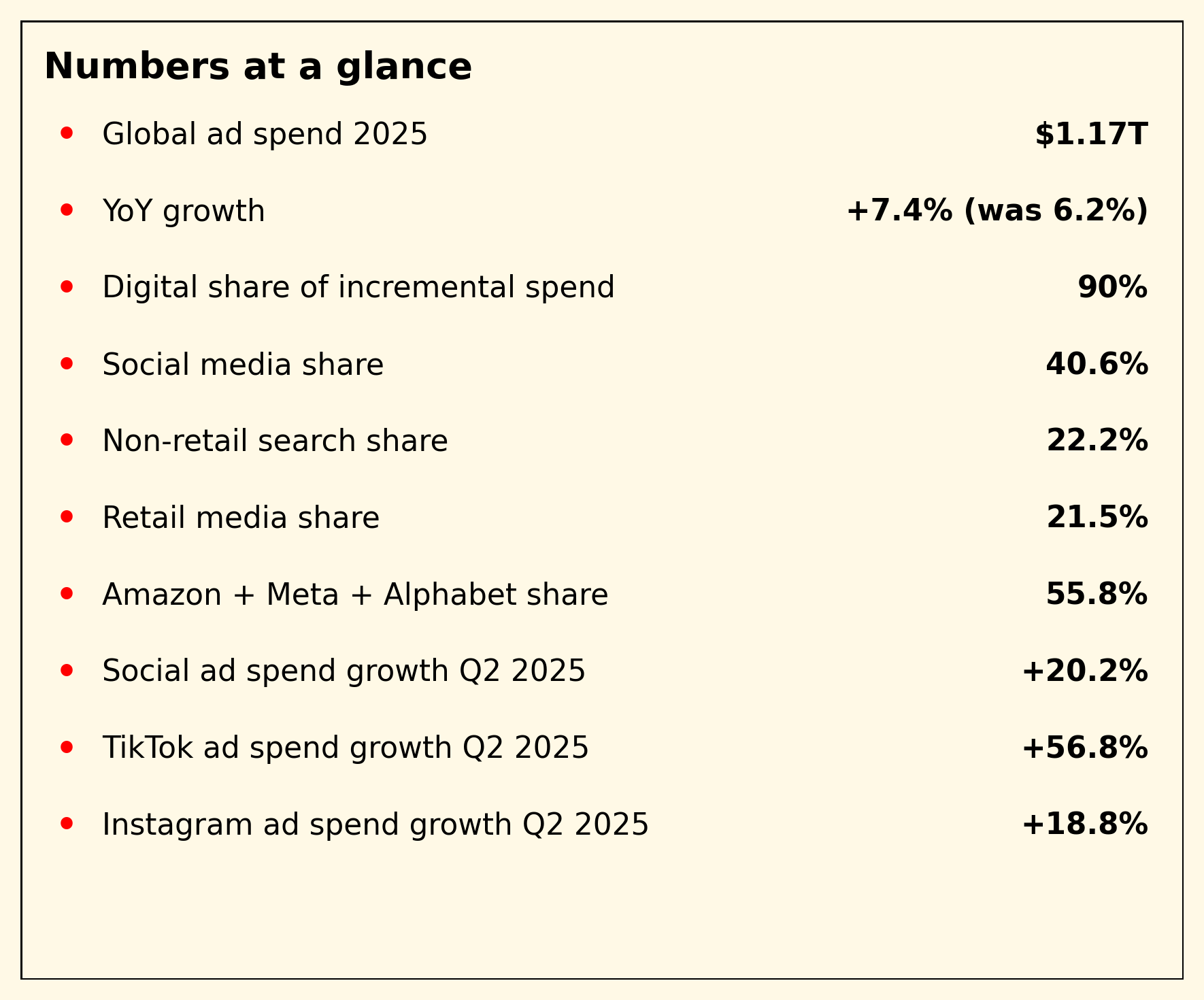 WARC forecasts $1.17 trillion in 2025 ad spend, growing 7.4% YoY (up from earlier 6.2% estimates). Nearly 90% of incremental dollars are going straight into digital, with social and retail media driving most of the gains.
