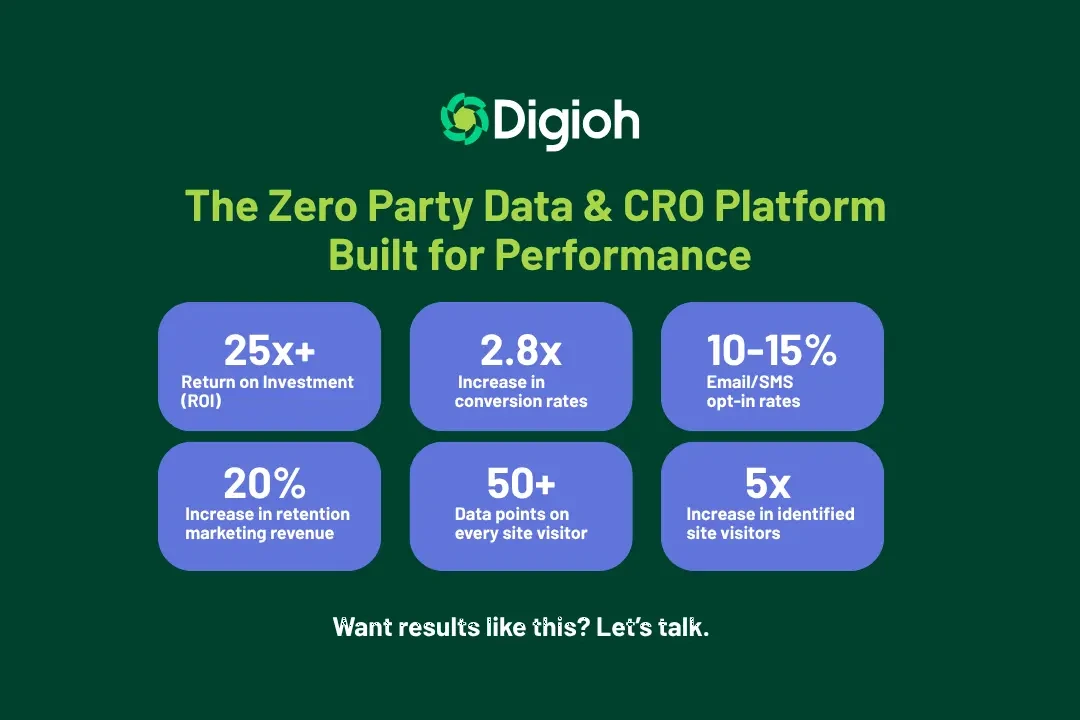 Digioh helps Shopify brands increase conversions with personalized quizzes, high-performing pop-ups, and advanced targeting tools that capture zero-party data and fuel revenue-driving campaigns.