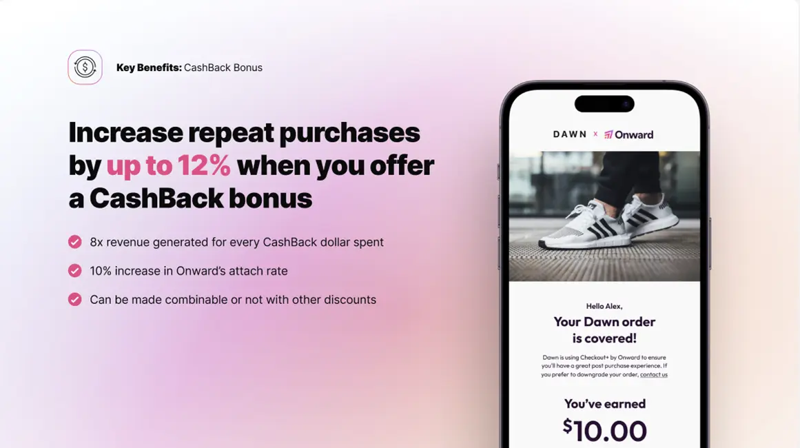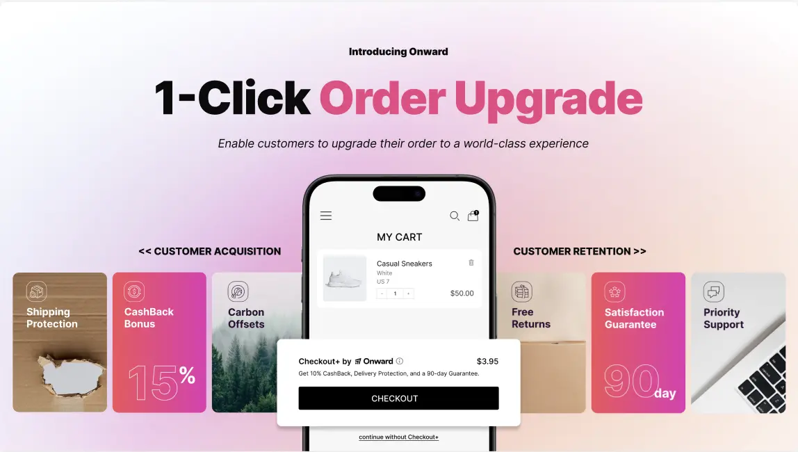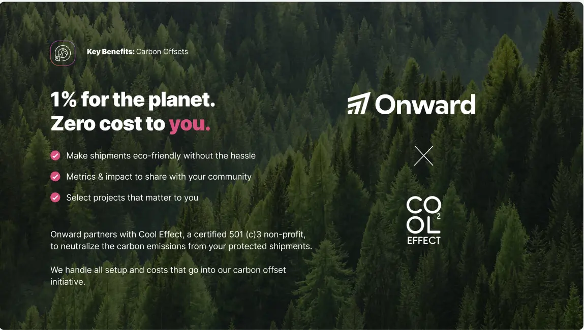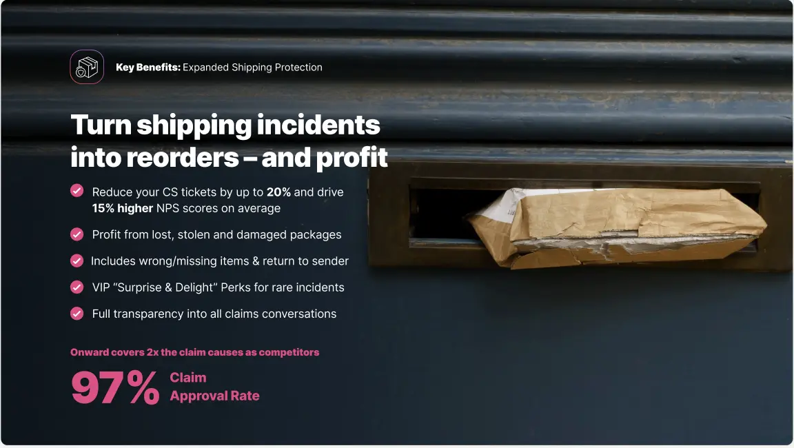 Onward provides shipping protection, cash-back offers, satisfaction guarantees, and free returns to enhance the customer experience and increase profit per order.