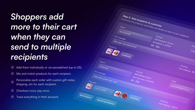 Now you can easily add a multi-recipient checkout experience to your store, fully integrated with Shopify, and fully customizable to fit your branding. Shoppers can add recipients with address autocomplete, from saved addresses or via upload. They can send different items to different recipients, and personalize gift messages for each. Checkout is quick and easy and individual orders are generated in your store in seconds.