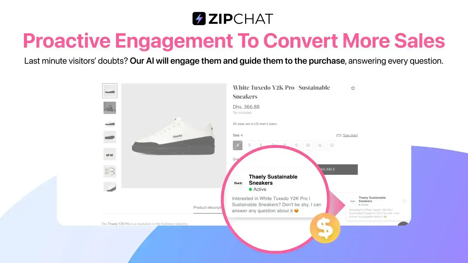 Zipchat's AI engages visitors based on browsing behavior, addressing hesitations and guiding them toward purchases. By answering questions instantly and offering tailored recommendations, it helps brands achieve up to 44% chat-to-sale conversion rates and higher average order values (AOV).